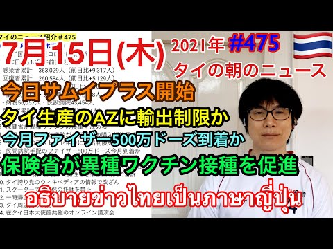 2021年7月15日タイの朝のニュース紹介、保健省が異種ワクチン接種を促進、今日サムイプラス開始、タイ生産のAZに輸出制限か、今月ファイザー500万ドーズと到着か、など
